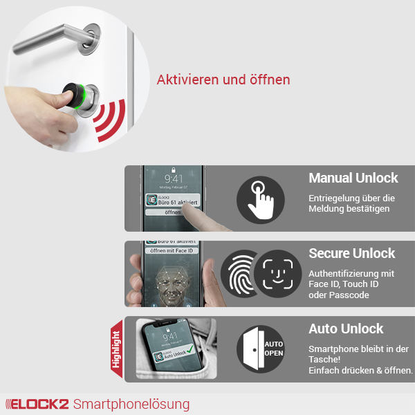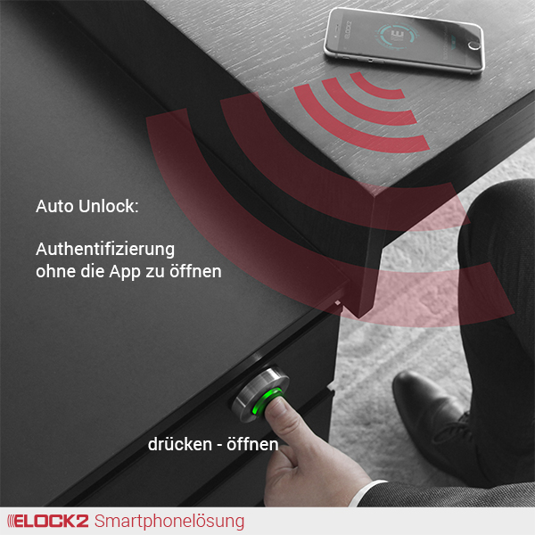 Lassen Sie Ihr Smartphone einfach in der Tasche – Ihr ELOCK2 System erkennt Sie automatisch und öffnet die Tür, online oder offline, ganz von selbst.