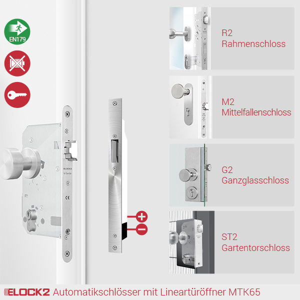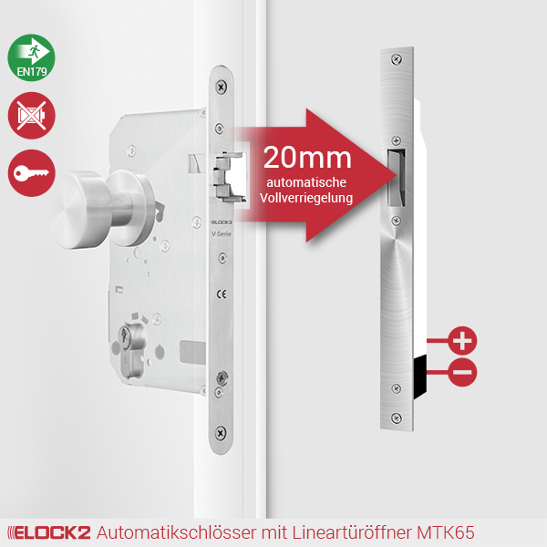 Die Türöffnerkombination kombiniert ein selbstverriegelndes Automatikschloss mit Panikfunktion und ermöglicht zugleich die elektrische Öffnung über Lineartüröffner oder externe Systeme. Ideal für Objekte, in denen mechanische Zuverlässigkeit und elektronische Steuerung perfekt zusammenspielen sollen.