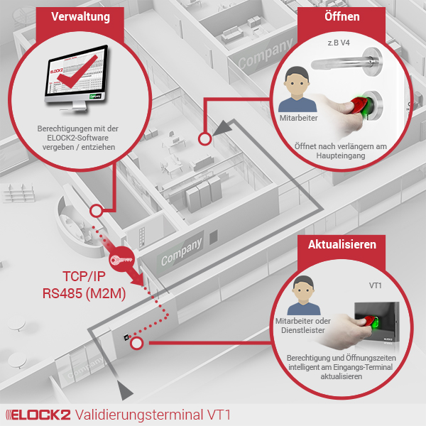 Das Validierungsterminal kann an entlegenen Standorten installiert werden und bietet eine komfortable Verwaltung von Zutrittszeiten & Berechtigungen, ohne dass eine ständige Serververbindung erforderlich ist.